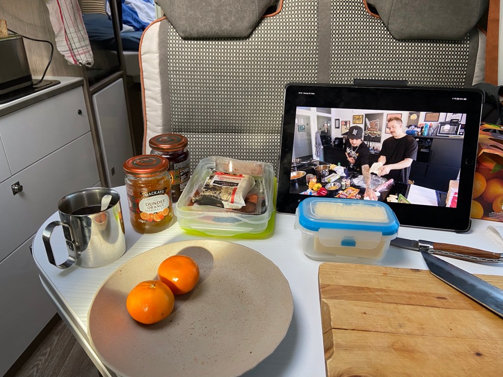 Doch vor der Arbeit da ist erst mal Frühstück angesagt. Toast ist dabei Pflicht. Der kleine Toaster von WMF für eine Scheibe tut da gute Dienste. Kompakt und relativ sparsam im Stromverbrauch. Eine Scheibe schlägt mit ca. 1 Ah zu Buche.
