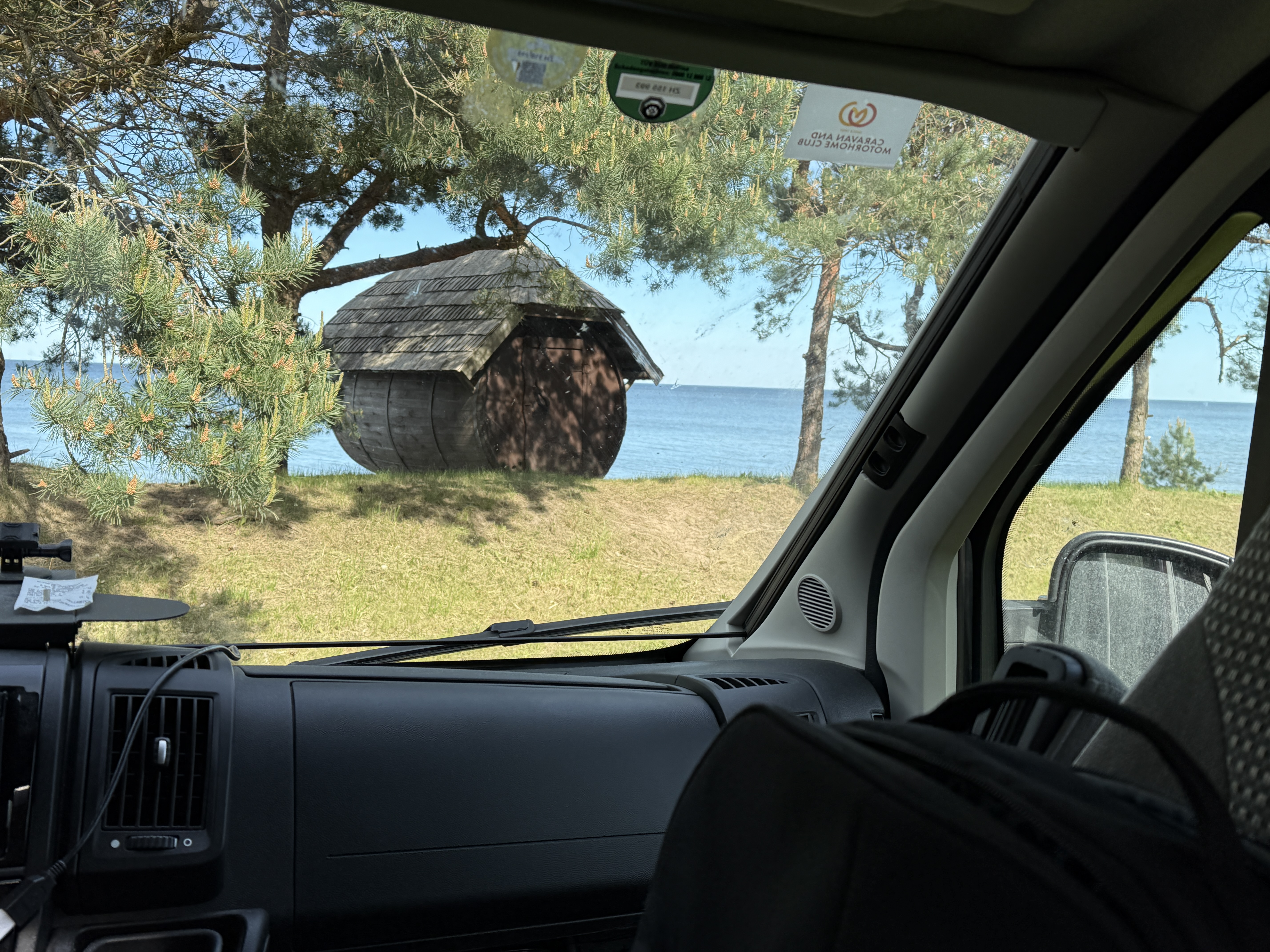 Ich hab’s mir lieber gutgehen lassen und noch mal 3.50 € draufgelegt – für den Campingplatz Mensils. Der liegt idyllisch direkt am Meer, nur durch ein paar Campingpods von der Brandung getrennt. Sollte es also heute Nacht stürmen, gibt’s morgen früh vielleicht Strandgut aus Holz – und eine freie Sicht auf die Wellen inklusive.