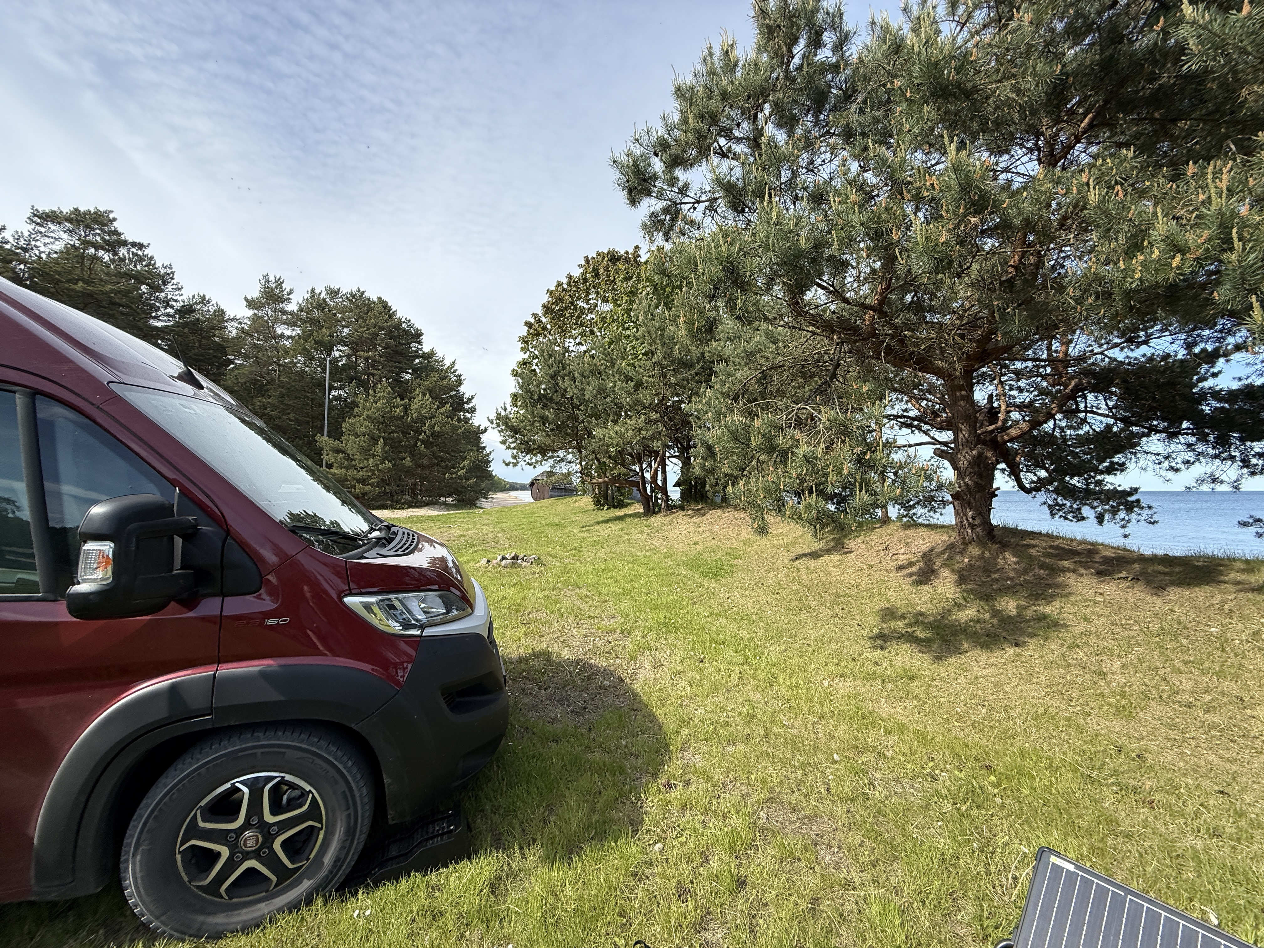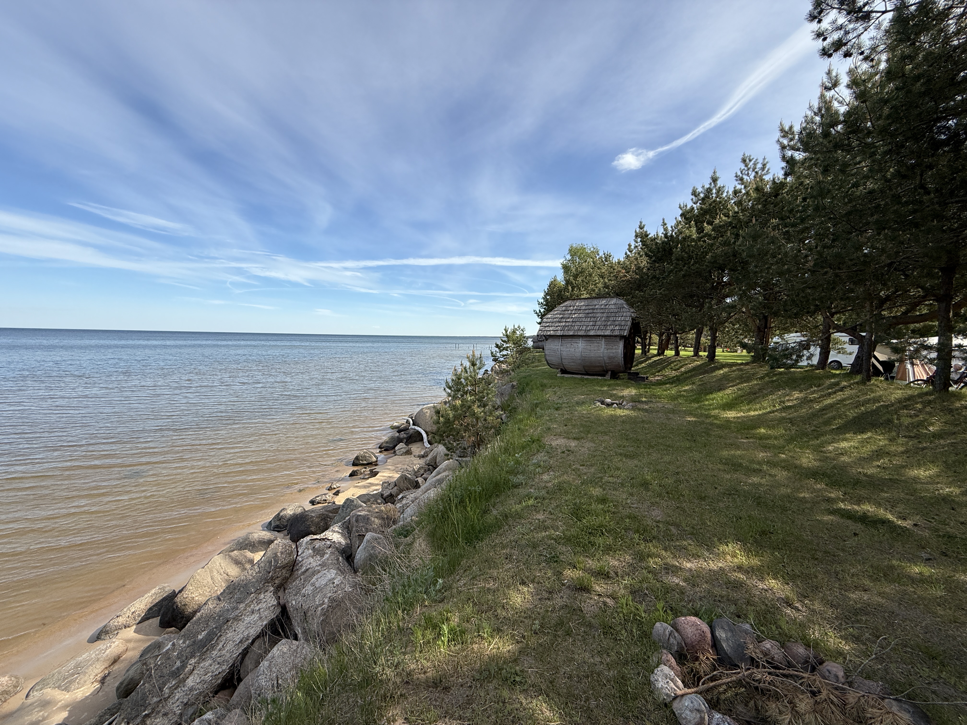 Nach einer angenehm ungestörten Nacht (ja, es geht auch mal ohne Regentrommeln), tuckere ich weiter nordwärts der Westküste entlang – Ziel: Kap Kolka. Doch bevor es ganz nach oben geht, schnell noch ein Abstecher zum Leuchtturm bei Oviši. Klingt romantisch, sieht auf den ersten Blick auch ganz klassisch aus… bis man merkt: Der gute Turm steht mitten im Wald, rund 500 Meter vom Meer entfernt. Man fragt sich unweigerlich: Hat sich das Meer zurückgezogen? Oder hat sich der Leuchtturm einfach verlaufen?